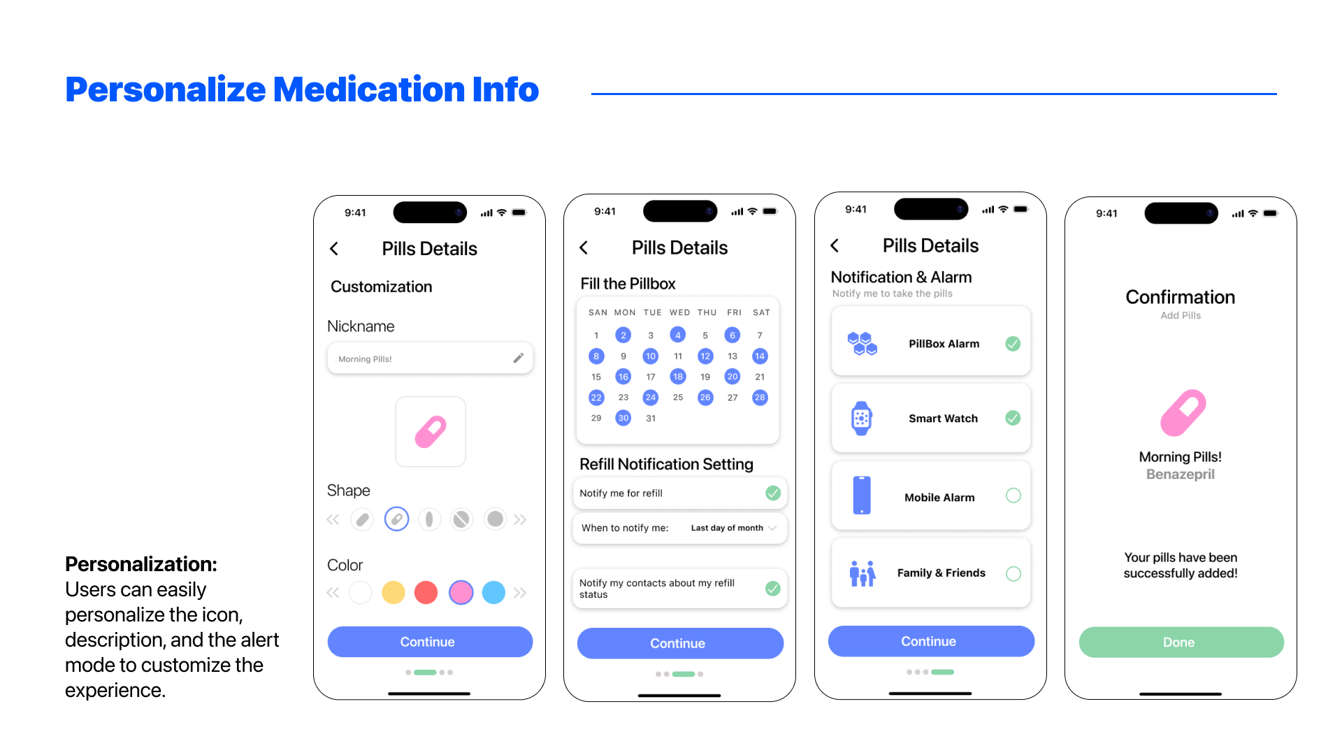 We held numerous testing sessions to perfect the user flow of the application, the color combination choices of the app, and the placements of the UIs. For the physical product, we set the dimensions based on popular products on Amazon and tested with users to see if the sizing of each pillbox makes sense.